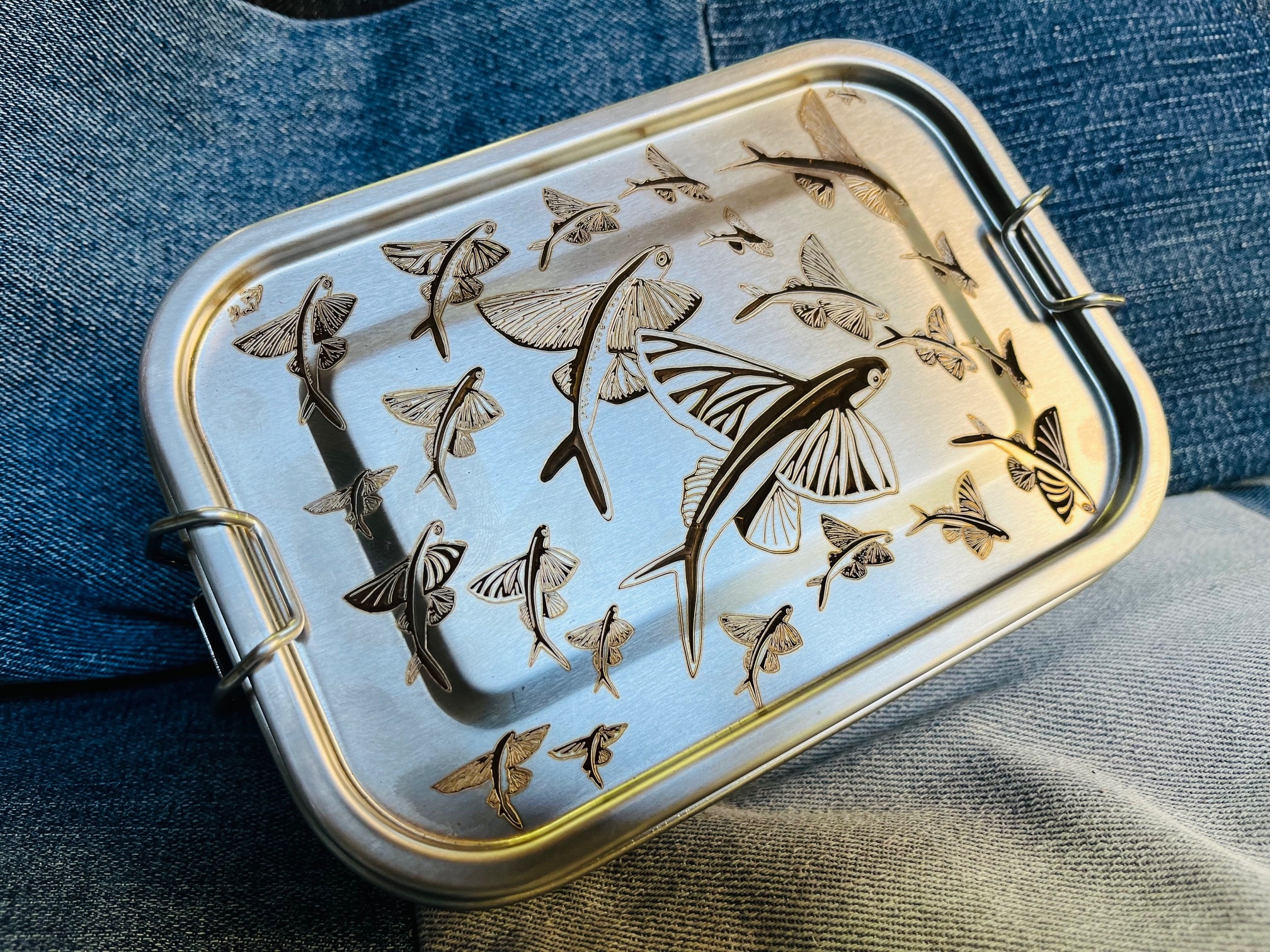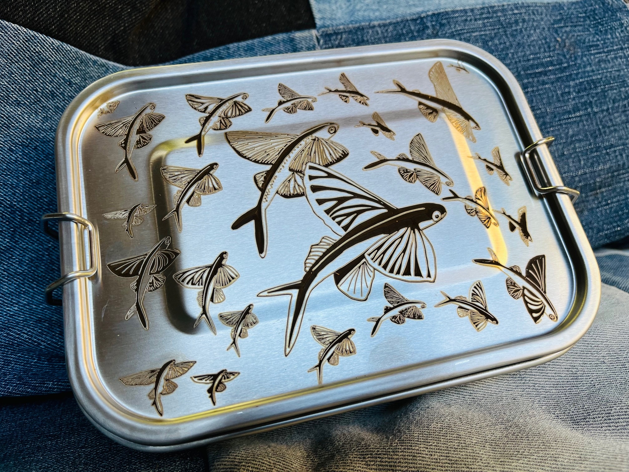 Les dessins gravés sur les barquettes inox ont été créés spécialement pour les barquettes à repas Goodbye Plastic ! par des artistes locaux de l’île de La Réunion, gravures réalisées dans notre atelier de Saint-Pierre.